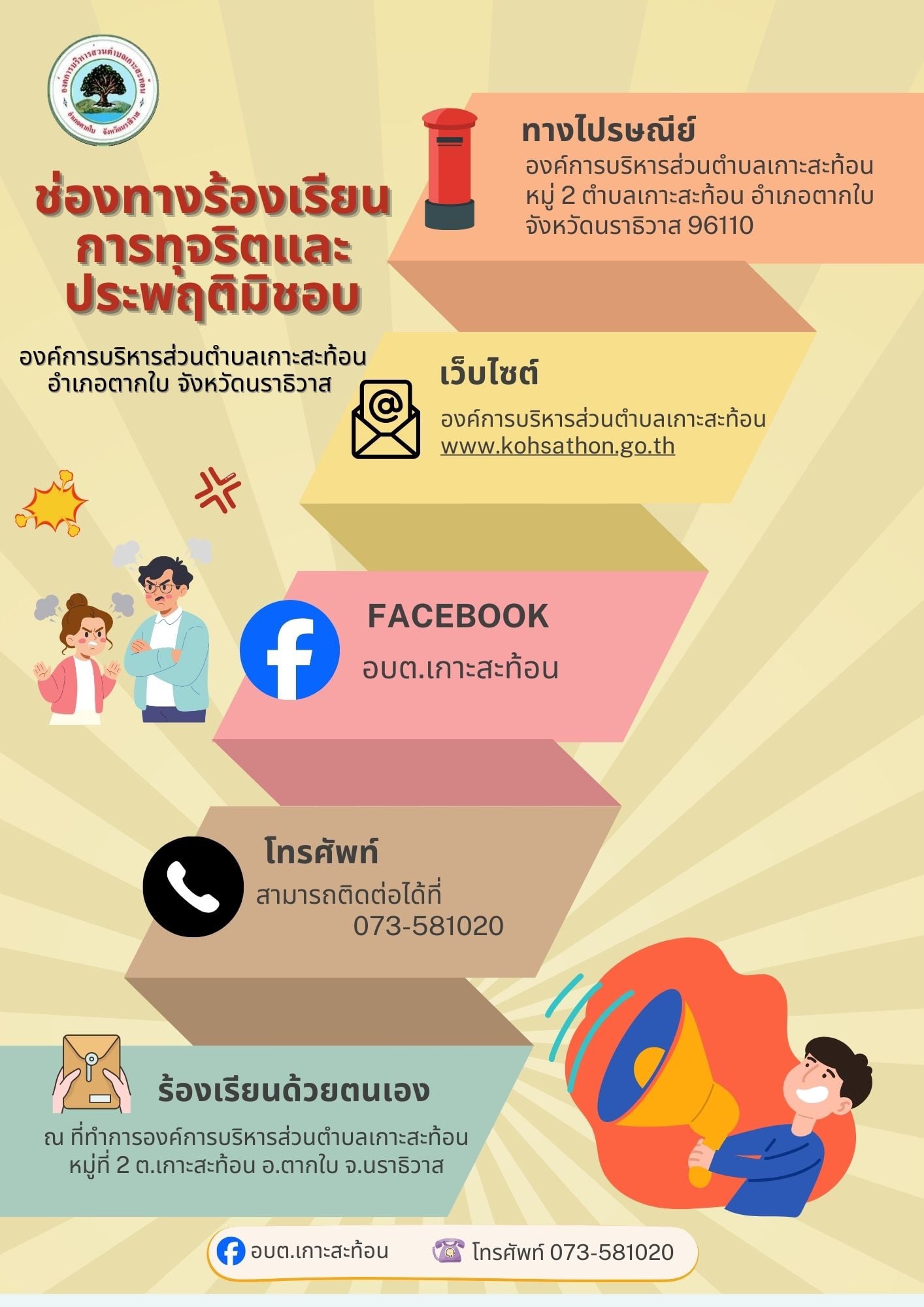 ช่องทางแจ้งเรื่องร้องเรียนการทุจริตของหน่วยงาน :: องค์การบริหารส่วนตำบลเกาะสะท้อน